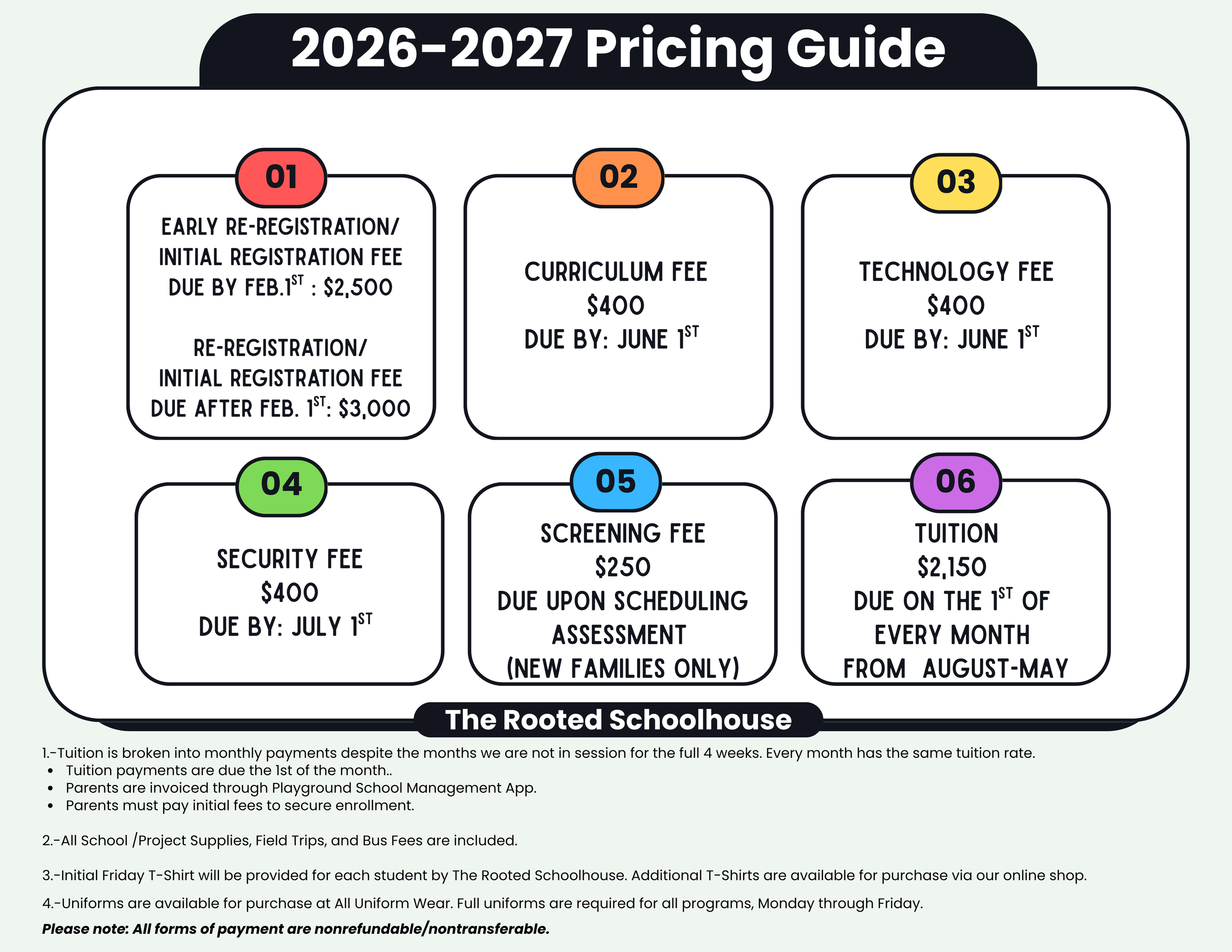 All School Supplies, Project Supplies, Weekly Field Trips, Bus Fees, and End of Year Homeschool Evaluations are included for the 2026-2027 School Year.